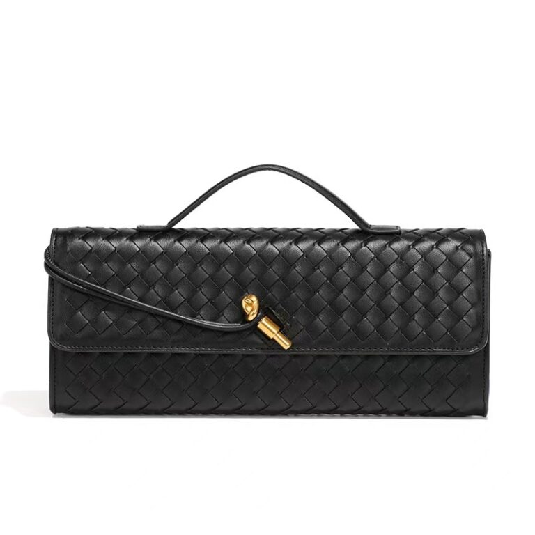 Bottega Veneta black woven leather clutch bag with a knot-style closure.