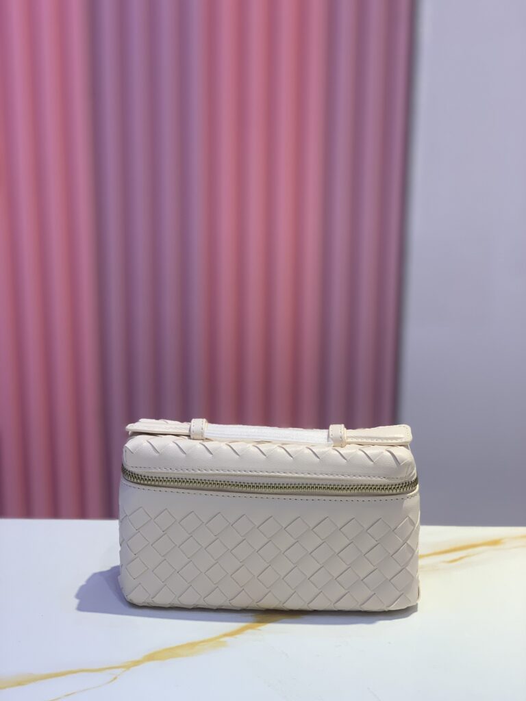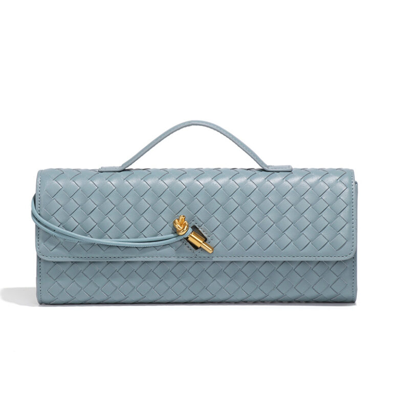 Green woven clutch bag with a top handle and a gold mortise lock closure