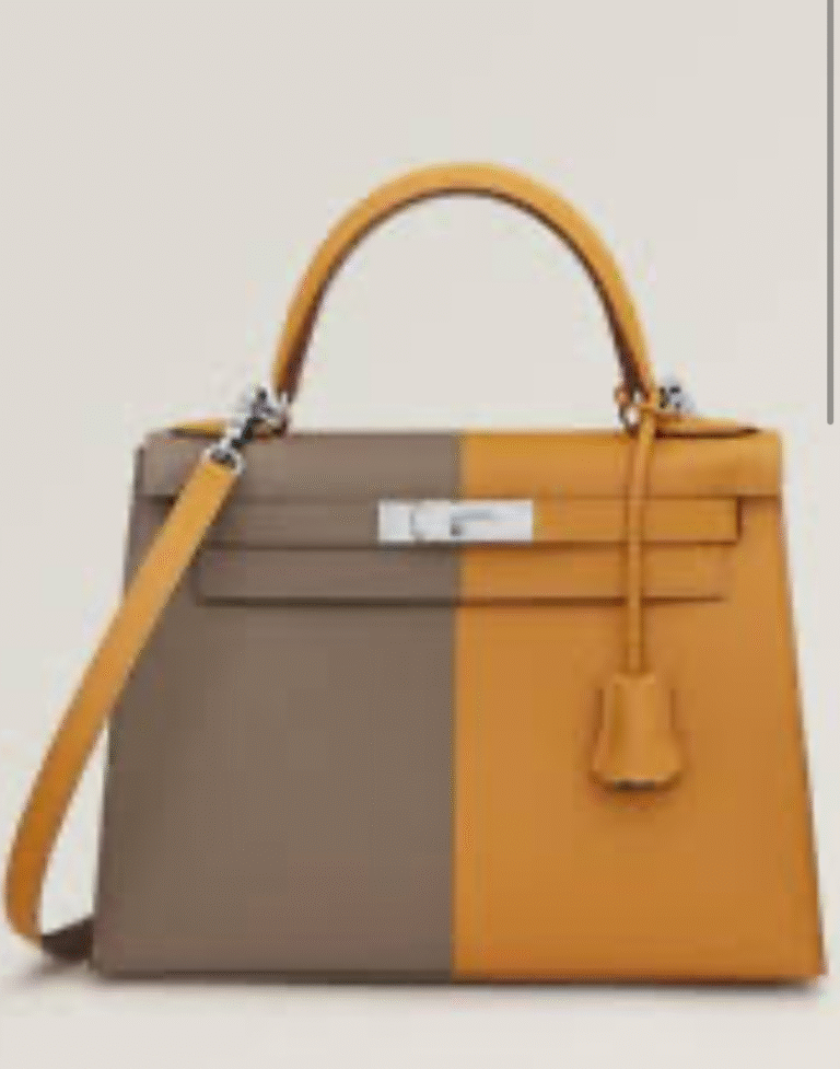 limited edition Hermès Kelly 28 Sellier Casaque bag in Epsom leather featuring Etoupe and Sesame colors with palladium hardware
