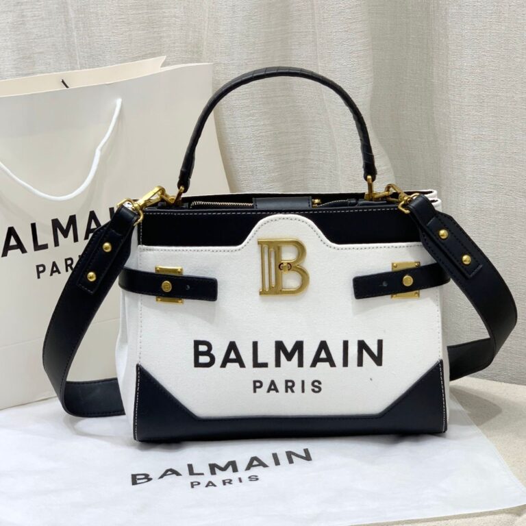Balmain B-Buzz Small Top Handle bag in monogrammed canvas and leather